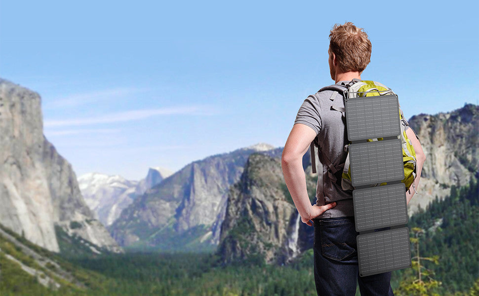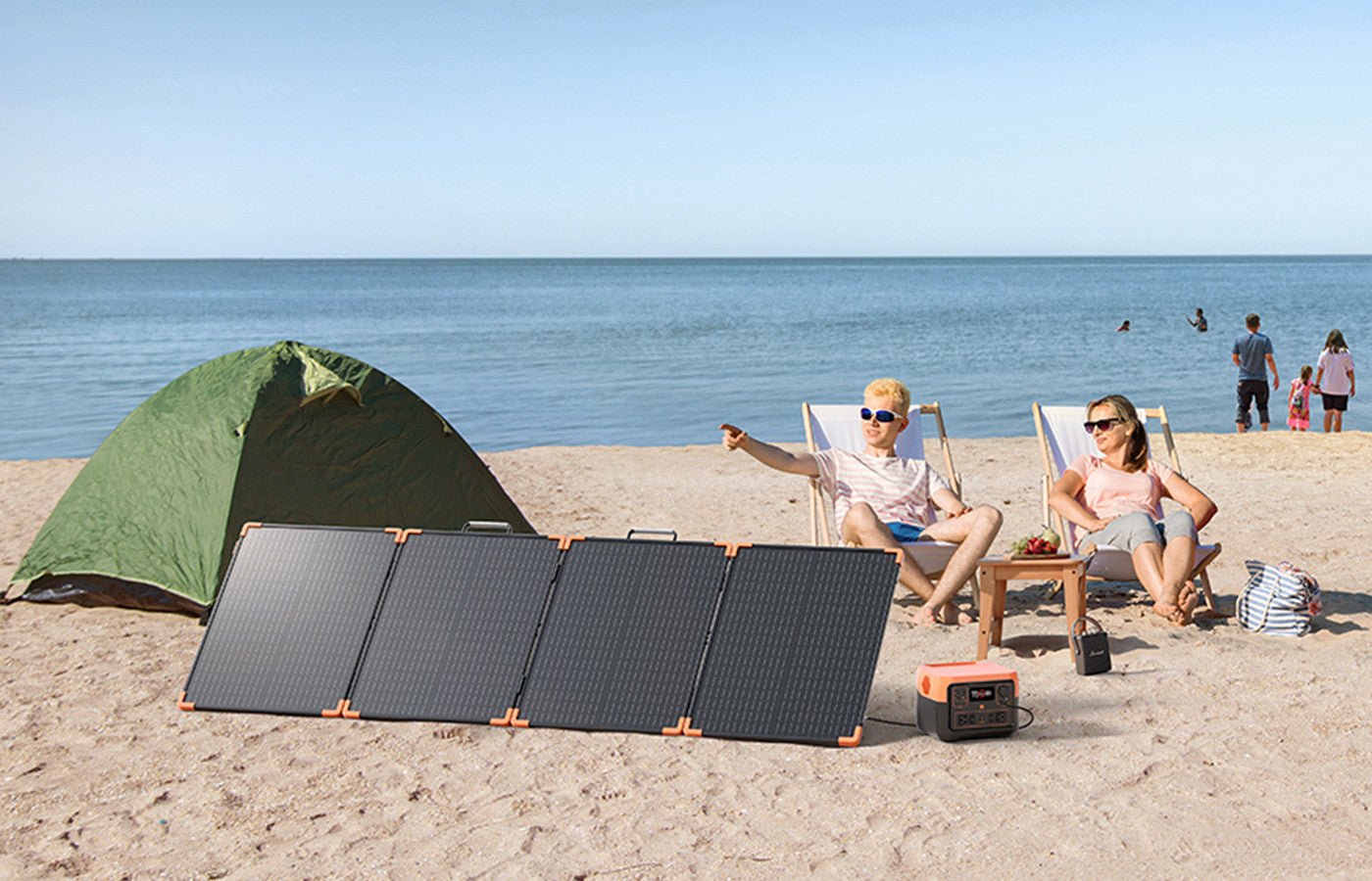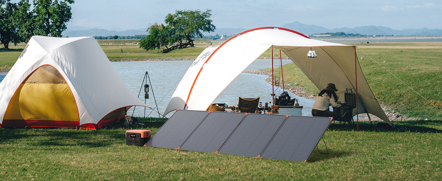 High-power foldable solar panel with an aluminum frame and ETFE surface, featuring monocrystalline silicon cells. PowerFold Series perfect for charging power stations, ideal for camping, RV trips, and mobile outdoor use.