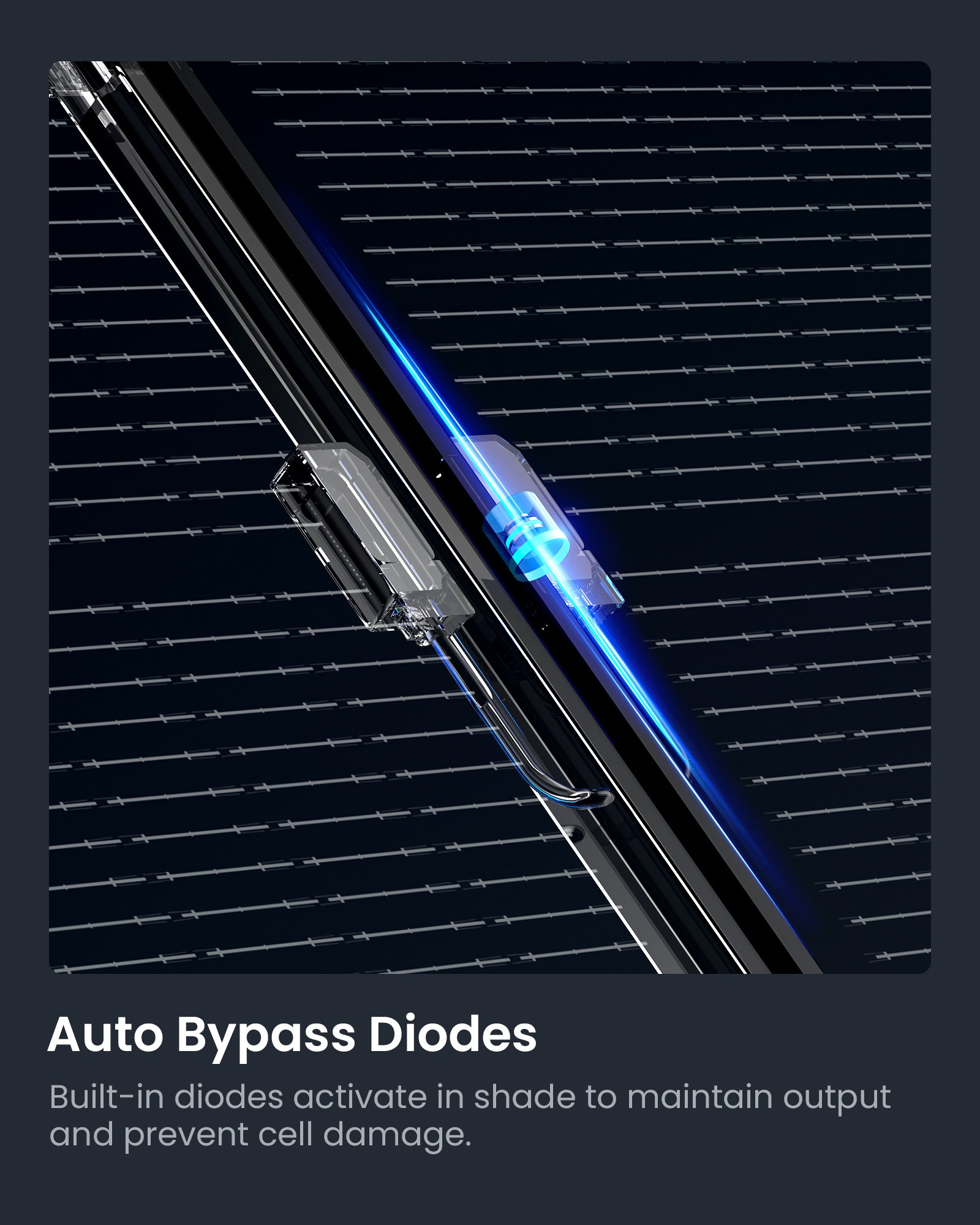 Integrated auto bypass diodes automatically activate under partial shading to maintain power output, reduce energy loss, and prevent hotspot damage—ensuring safe and reliable operation in real-world outdoor conditions.